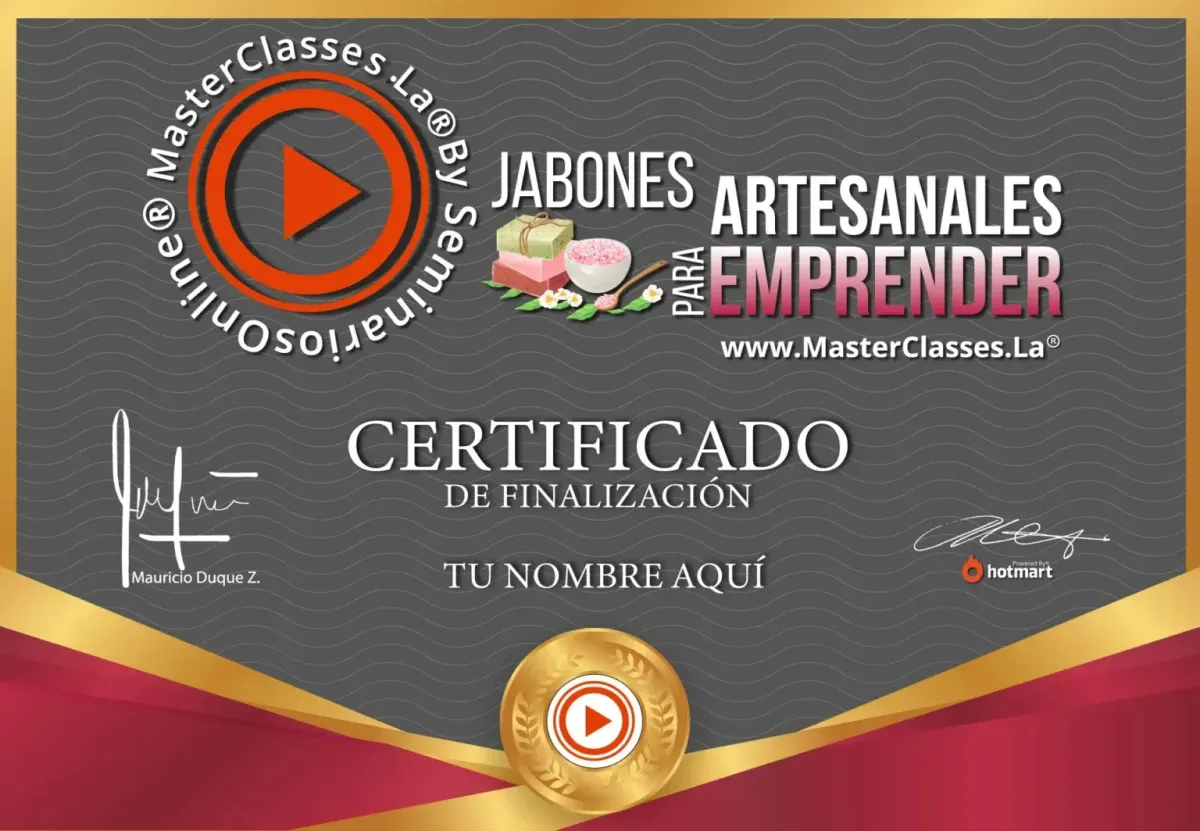 Estás buscando obtener un certificado avalado que respalde tu conocimiento en la elaboración de jabones artesanales, otorgado por Hotmart y Seminarios Online.